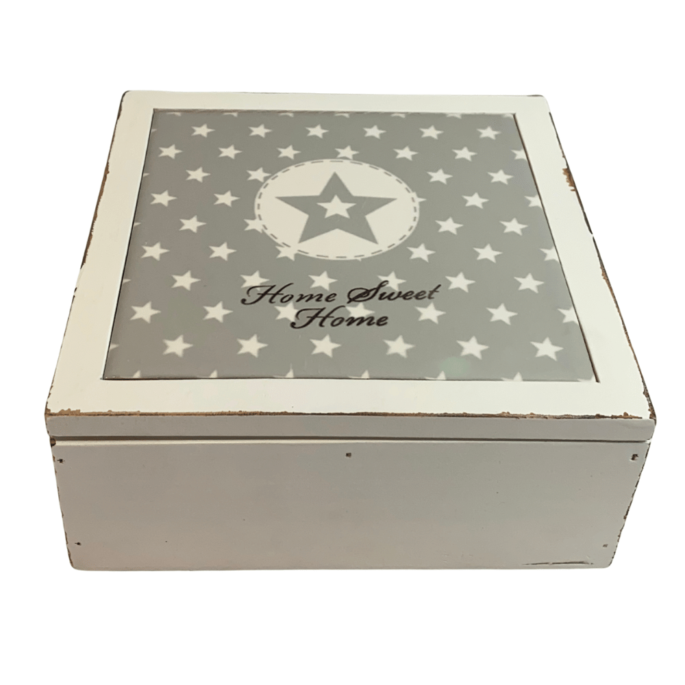 Herbaty pakowane są w przepiękną rustykalną drewnianą skrzynkę z ceramiczną płytką w przykrywce. Przepiękna biało-szara przykrywka z gwieździstym motywem i napisem "Home Sweet Home" nadaje pudełeczku niepowtarzalnego uroku. Drewniana skrzynka otwiera się do kąta 180 st. W środku znajdują się cztery przegródki wypełnione herbatami. Każda piramidka jest dodatkowo zapakowana w hermetyczną kopertę, dzięki czemu dłużej zachowuje świeżość i aromat.