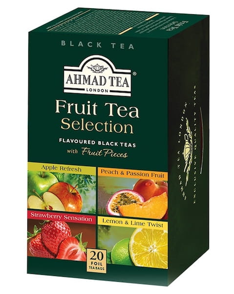 Ahmad Tea Fruit Selection to kolekcja herbat czarnych smakowych z dodatkami owoców. W zestawie znajdują się: czarna herbata z jabłkiem, czarna herbata z cytryną i limonką, czarna herbata z truskawką i czarna herbata z brzoskwinią i marakują.