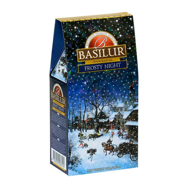 Herbata Basilur Frosty Night to przepyszna zimowa mieszanka czarnej herbaty z owocami oraz nutą wanilii i migdałów. W skład mieszanki wchodzi czarna wysokiej jakości herbata gatunkowa: BOP1 uprawiana na Sri Lance oraz prawdziwe owoce i płatki kwiatów. Herbata pakowana jest w ozdobny kartonik z zimowym motywem.
