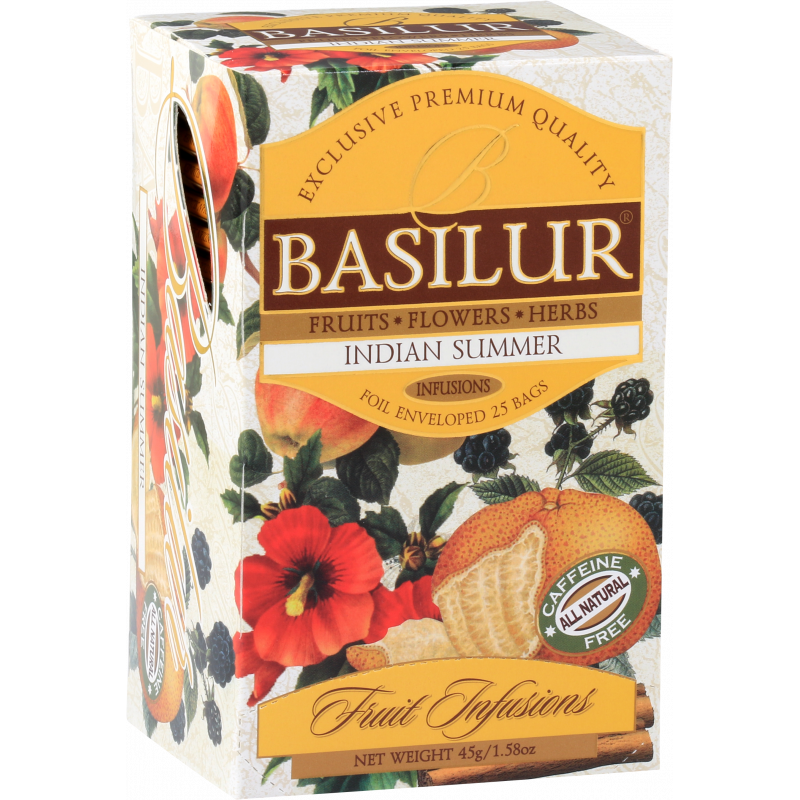 Herbata Basilur Indian Summer to susz owocowy z dodatkiem cynamonu i płatków kwiatów. To oryginalna kompozycja słodkich owoców z hibiskusem i cynamonem. Połączenie, które ogrzeje w zimne wieczory i orzeźwi w gorące dni w formie "na zimno". Herbata Basilur zapakowana jest w ozdobny kartonik, który sprawia, że herbata idealnie nadaje się na prezent.