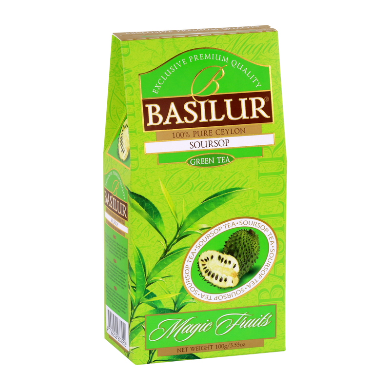 Herbata Basilur Soursop to wielkolistna zielona herbata bardzo wysokiej jakości z dodatkiem owoców flaszowca i kiwi. Flaszowiec zwany również graviolą lub guanabana to bardzo odżywczy owoc, który posiada właściwości antywirusowe i antyrakowe. To wspaniałe połączenie nadaje naparowi przyjemnie kwaskowego, owocowego smaku. Zielona herbata bogata w polifenole oraz przeciwutleniacze, wspaniale wpływa na zdrowie i urodę!