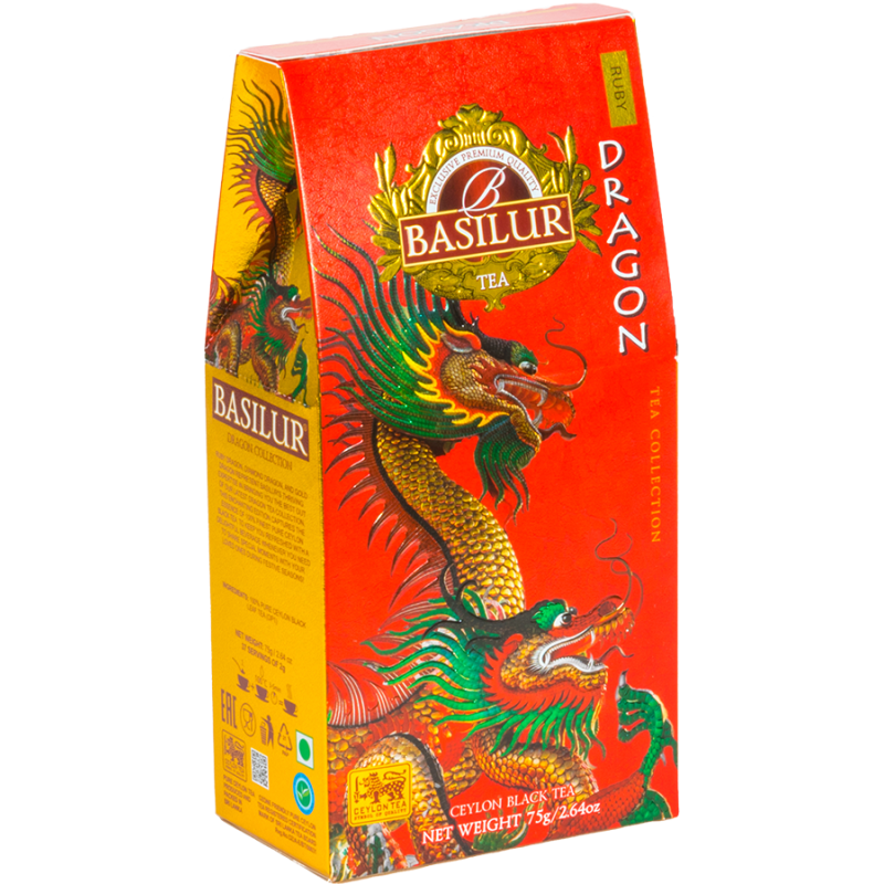 Herbata Basilur Ruby Dragon to wysokiej klasy liście czarnej herbaty OP1 bez dodatków. Długie całe liście bez pączków to wysokiej jakości gatunek herbaty, który daje napar o głębokim aromacie bez goryczki. Herbata Basilur zapakowana jest w ozdobny kartonik, który sprawia, że herbata idealnie nadaje się na prezent.