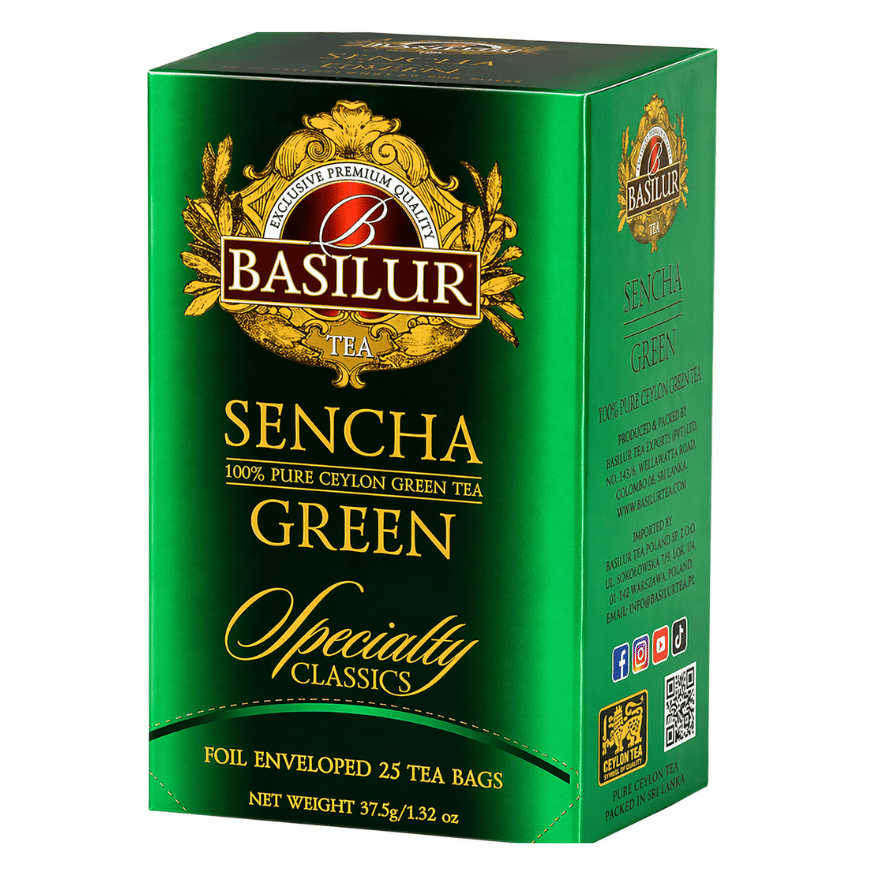 Herbata Basilur Sencha z kolekcji Specialty Classics to zielona herbata wysokogórska, która charakteryzuje się delikatnym aromatem i jasno żółtym naparem. Herbata zawiera małe listki pochodzące z górnej części krzewu herbacianego, który sprawia, że ma ona łagodny i przyjemny smak pozbawiony goryczy.