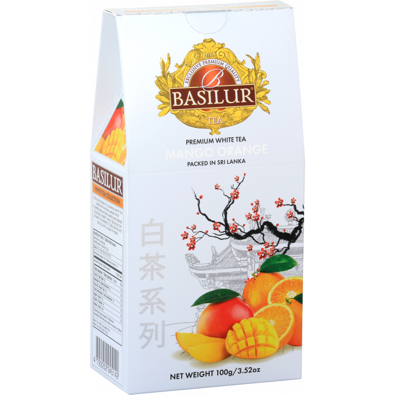Herbata Basilur White Tea Mango Orange to wysokiej klasy herbata biała, która powstała z wyselekcjonowanych liści najwyższej jakości. Ma ona bardzo delikatny i subtelny smak, który zawdzięcza naturalnym sposobom suszenia liści. Jest bardzo bogata w antyoksydanty, które spowalniają procesy starzenia i działają detoksykująco. Połączenie szlachetnych liści z kawałkami soczystego mango, kwiatem pomarańczy i naturalnymi nutami owoców sprawia, że napar nabiera wyśmienitego orzeźwiającego smaku. Oryginalna herbata Basilur zapakowana jest piękny kartonik z kolekcji białych herbat, który sprawia, że herbata idealnie nadaje się na prezent.