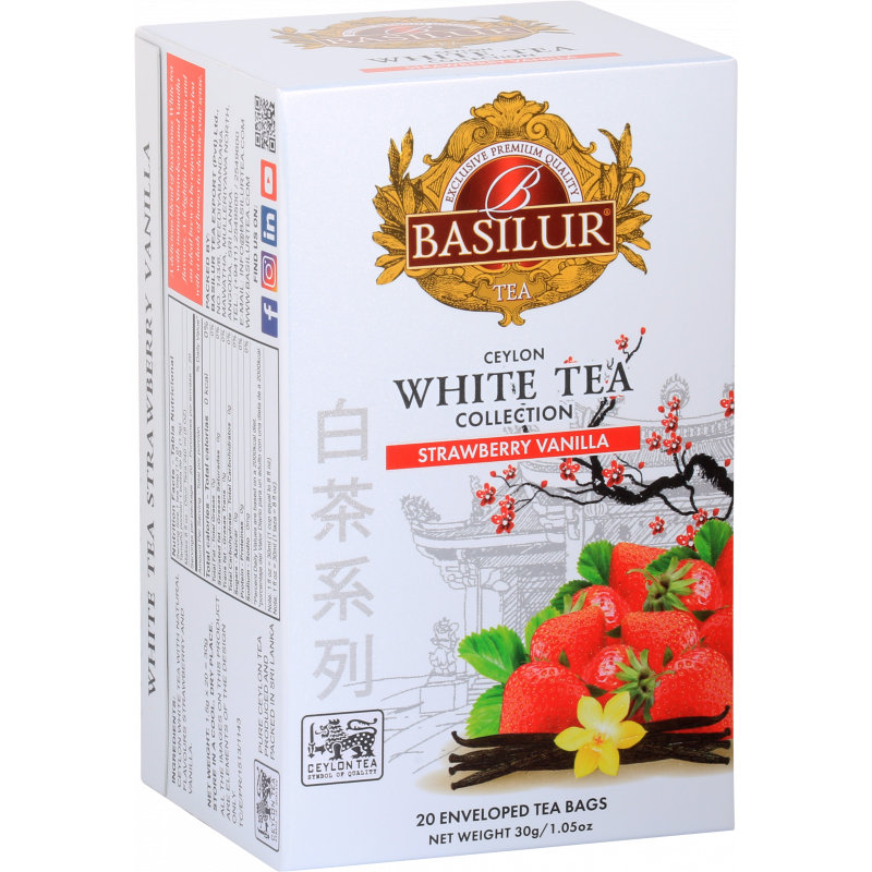 Herbata Basilur White Tea Strawberry Vanilla to wysokiej klasy herbata biała, która powstała z wyselekcjonowanych liści najwyższej jakości. Ma ona bardzo delikatny i subtelny smak, który zawdzięcza naturalnym sposobom suszenia liści. Jest bardzo bogata w antyoksydanty, które spowalniają procesy starzenia i działają detoksykująco. Połączenie szlachetnych liści z naturalnymi nutami truskawki i wanilii sprawia, że napar nabiera wyśmienitego smaku i jest istnym deserem dla podniebienia. Oryginalna herbata Basilur zapakowana jest piękny kartonik z kolekcji białych herbat, który sprawia, że herbata idealnie nadaje się na prezent.