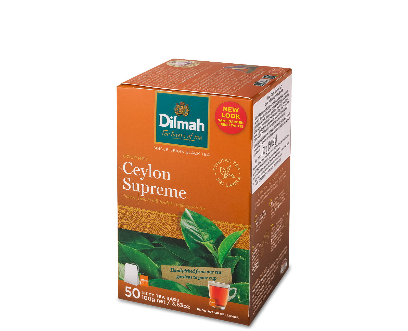 Dilmah Ceylon Supreme to wysokiej jakości cejlońska czarna herbata o liściu BOPF. Cechuje się wyrazistym smakiem i naparem o głębokiej barwie. To przepyszna herbata z serii Dilmah Gourmet, pakowana w dwugramowe torebki z zawieszką.