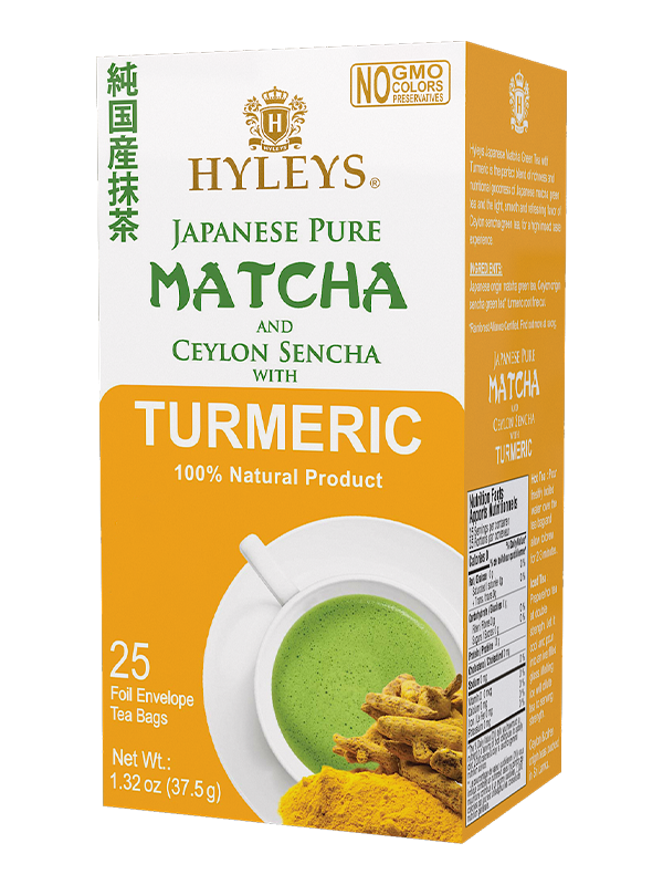 Kolekcja herbat HYLEYS Japanese Matcha to w 100% naturalne klasyczne oraz smakowe herbaty składające się głownie z japońskiej matchy i Senchy ze Sri Lanki. Oba rodzaje herbaty znane są ze swoich właściwości antyoksydacyjnych, zwalczających wolne rodniki i wspomagających nasz układ odpornościowy. Ta propozycja to napar lekko pobudzający, o bogatym smaku z oczyszczającym organizm korzeniem kurkumy.