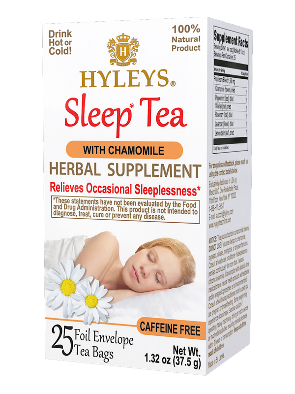 Herbata Hyleys Sleep Tea z rumiankiem, walerianą i melisą. To specjalnie opracowana mieszanka ziół, która pomaga w uspokojeniu organizmu, odpoczynku i relaksie. Napar nie zawiera kofeiny, więc można go spożywać o każdej porze dnia. Ułatwia zasypianie i wyciszenie.
