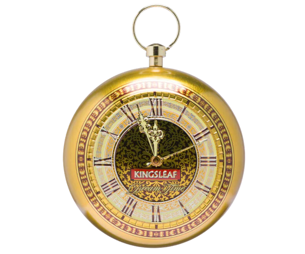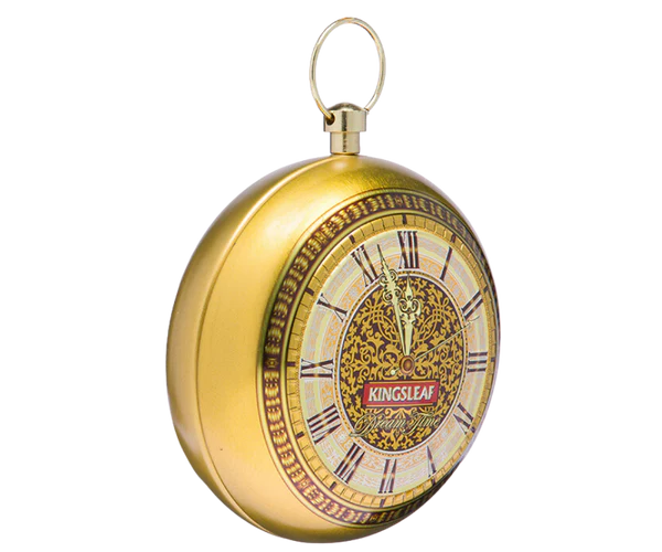 Herbata została zamknięta w metalowej puszce w kształcie kieszonkowego zegarka, utrzymanej w luksusowym, złotym kolorze. To nie tylko praktyczne opakowanie, ale także piękny, kolekcjonerski element, który sprawdzi się jako idealny prezent dla konesera herbat. Wewnątrz znajduje się torebka strunowa chroniąca świeżość i aromat liści.