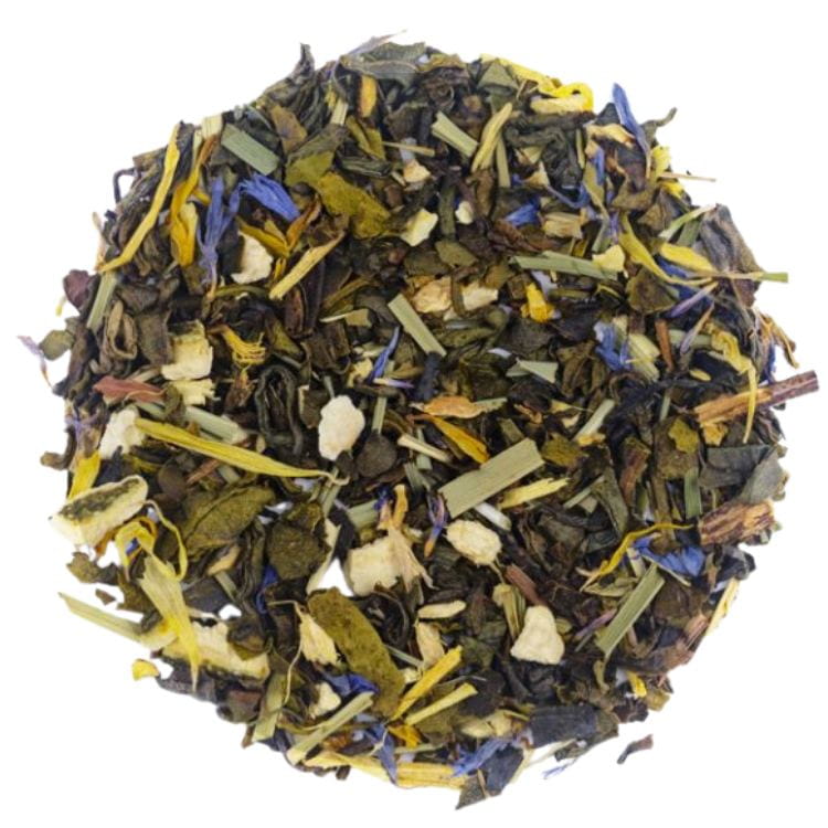 Mieszanka została wzbogacona o trawę cytrynową, skórkę cytryny, imbir, miętę i odrobinę lukrecji, które nadają jej lekko pikantny, a zarazem harmonijny profil smakowy. Całość dopełnia kwiat nagietka i kwiat bławatka oraz naturalny aromat cytrynowy. To herbata, która pobudza, odświeża i wprowadza w dobry nastrój – idealna zarówno na poranek, jak i w roli lekkiego naparu po posiłku.