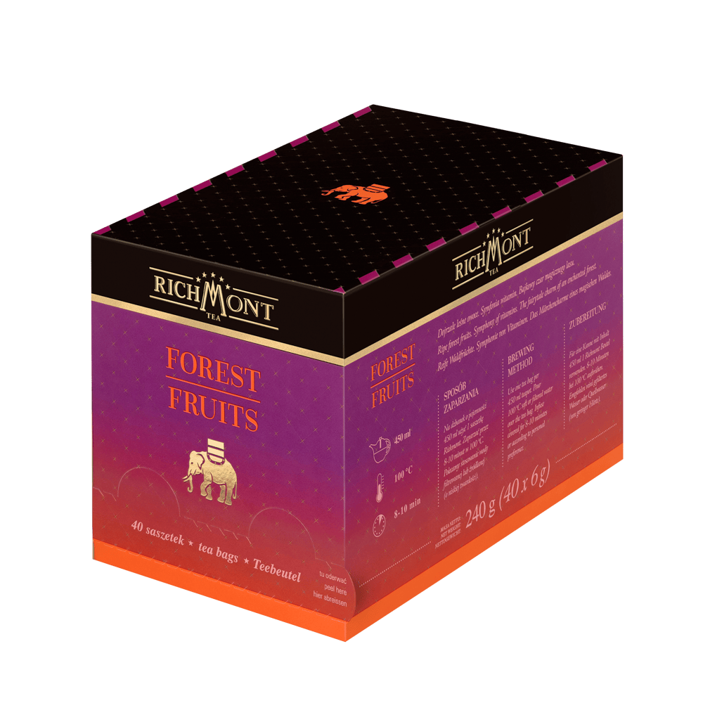 Richmont Forest Fruit to wyśmienita herbata o każdej porze dnia. Świetna dla dorosłych i dla dzieci dzięki zawartości witaminy C. Podczas parzenia herbata nabiera wyrazistego purpurowego koloru i cieszy smakiem owoców leśnych z delikatną nutą truskawki w śmietanie.