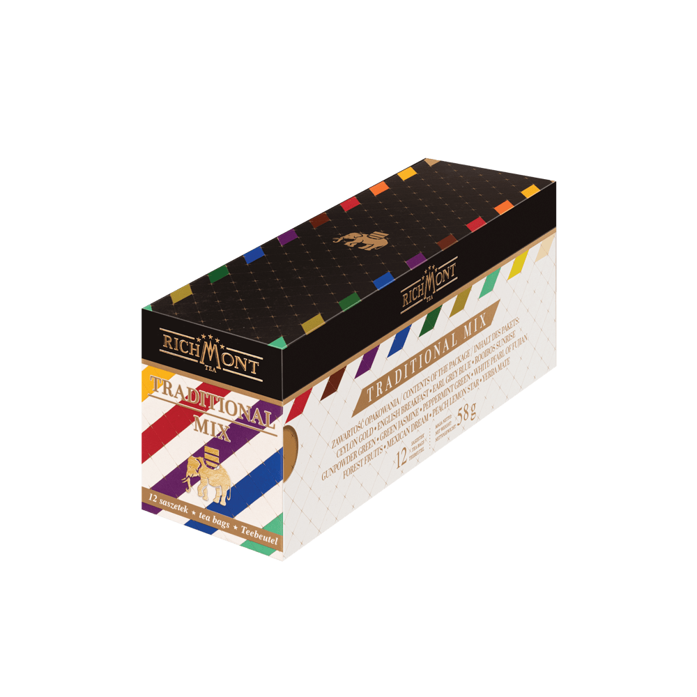 Propozycja herbaty Richmont Traditional Mix to idealne rozwiązanie dla osób, które dopiero chcą wypróbować smak i jakość herbat Richmont oraz dla tych, którzy lubią eksperymentować. 12 niecodziennych, ciekawych smaków z najróżniejszych gatunków i dodatków herbat.