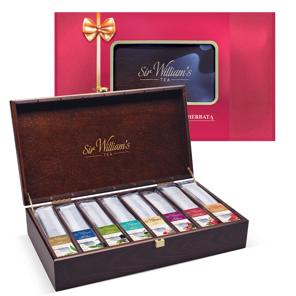 Zestaw herbat Sir William's Royal Taste 80 sztuk w drewnianym prezenterze to komplet wysokiej klasy herbat w 8 różnych smakach pakowanych po 10 saszetek z rodzaju. Ta elegancka drewniana skrzynka będzie idealnym pomysłem na prezent zarówno do biura jak i do domu, świetnie sprawdzi się też w restauracjach. Zestaw zawiera 8 oryginalnych smaków o naturalnych składnikach i ciekawych kompozycjach: Herbata Sir William's Royal Taste King of Ceylon, Sir William's Royal Taste Royal Earl Grey, Sir William's Royal Taste Green Kingdom, Sir William's Royal Taste Mint Prince, Sir William's Royal Taste Lord of Cherries, Sir William's Royal Taste Lady White, Sir William's Royal Taste Queen of Raspberries i Sir William's Royal Taste Cinnamon Princess