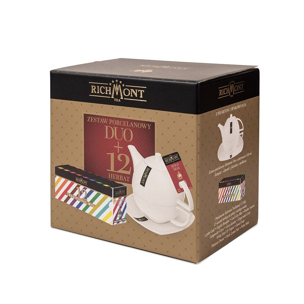 Zestaw Richmont Traditional Mix 12 saszetek z dzbankiem Richmont Duo to idealny zestaw dla smakoszy dobrej jakości herbat. Ceramiczny komplet z 12 różnymi smakami herbaty idealnie nadaje się również na prezent.